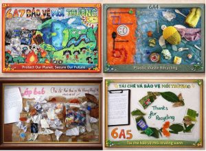 Creative products made from recycled materials by students spread the message of environmental protection and building a green lifestyle.